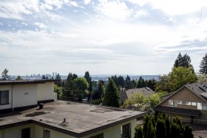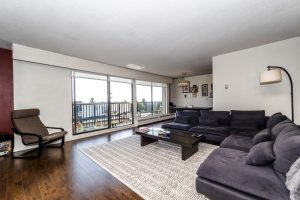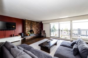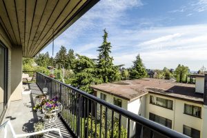 Almost 1200 square foot top floor, 2 bedroom & 2 bathroom, south-facing corner unit. Spacious renovated unit with wrap around balcony with city & water views, two large bedrooms, huge living room with fire place, house size laundry room, 1 parking space and a storage locker in a very well-maintained Upper Lonsdale building. 1st open house Sat/Sun 2-4 pm.