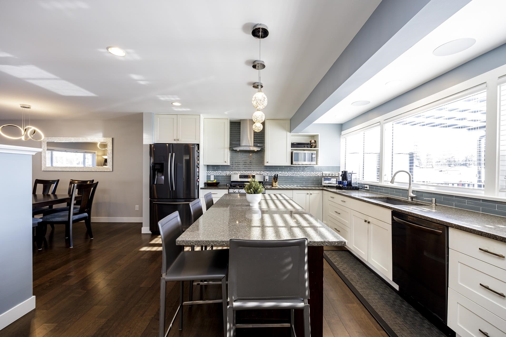 Nestled in prestigious Grand Boulevard, this exquisitely renovated residence offers 5 beds, 3 baths and over 3,200sqft. Main floor boasts an open concept kitchen with stainless appliances, grand central island, ample cupboard & counter space plus access to a partially covered private deck. Gleaming HW floors enhance the spacious living room with stylish gas f/p and adjoining dining area - all ideal for entertaining. 3 beds & 2 baths on the main including a generous primary with ensuite, walk in closet and access to that private deck. Down is an extra bedroom, rec room and separate nanny space ensuring privacy and comfort for all. Set on a South-facing 50x147 fenced lot (perfect for pets and kids) in an enviable area. A true family haven!